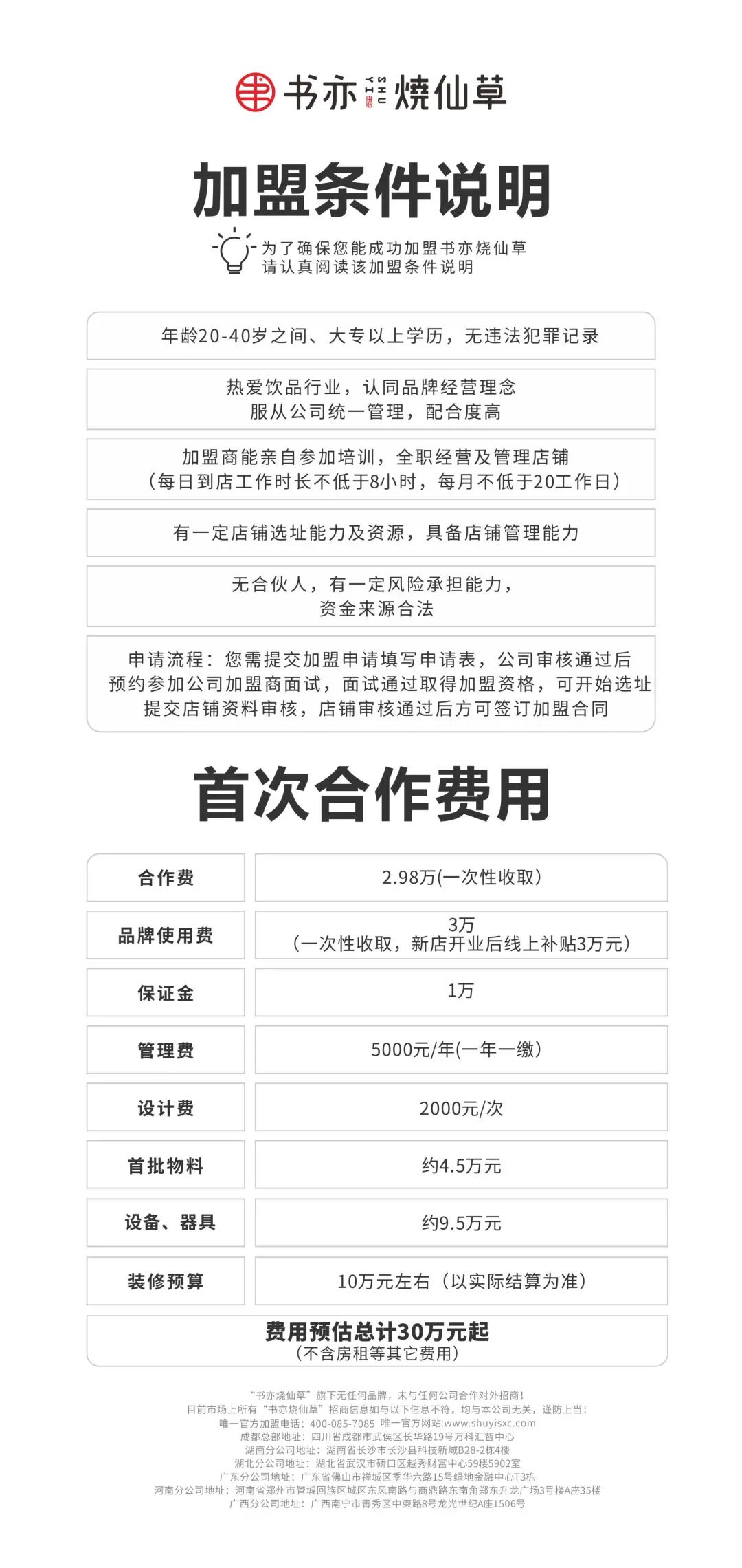 据其官网显示,目前要想开一家书亦烧仙草加盟门店,不包含房租、人力、水电等费用,前期投入约需30万元,包括一次性收取的合作费2.98万元、品牌使用费3万元、保证金1万元,一年一缴纳的管理费5000元,设计费2000元,首批物料约4.5万元,设备、器具约9.5万元,装修预算10万元左右。