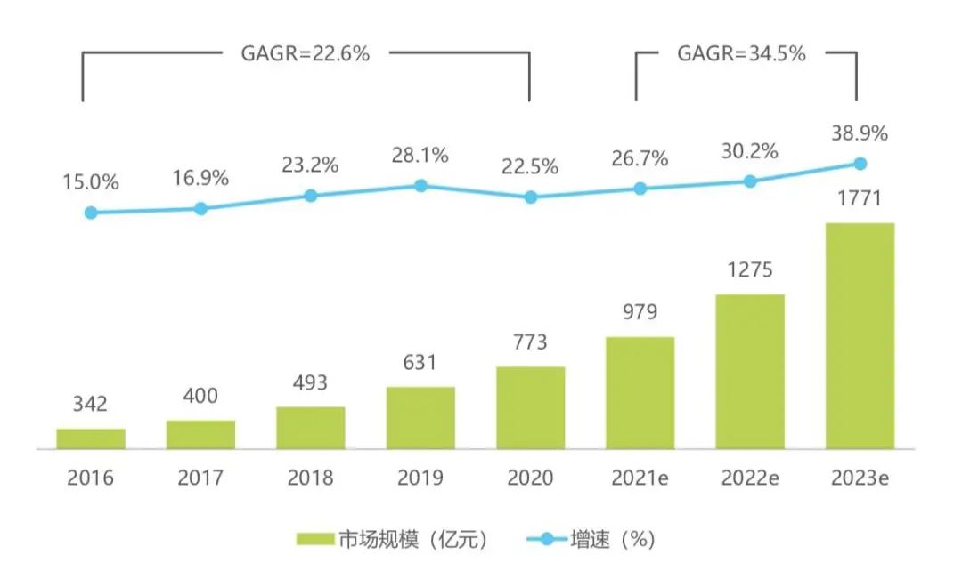 艾瑞咨询发布的《中国新式茶饮行业研究报告》显示,中国新式茶饮行业市场规模近5年呈现快速增长趋势,预计2021年到2023年的复合增长率为34.5%,到2023年,整体市场规模将超过1771亿元。