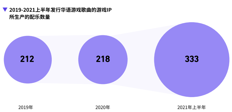 同时,2019年至2021年上半年,游戏配乐的发展同样也呈现了明显的增长态势。2021年仅上半年,发行华语游戏歌曲的游戏IP所生产的配乐数量达到了333首,较2020年全年增 了52.7%。