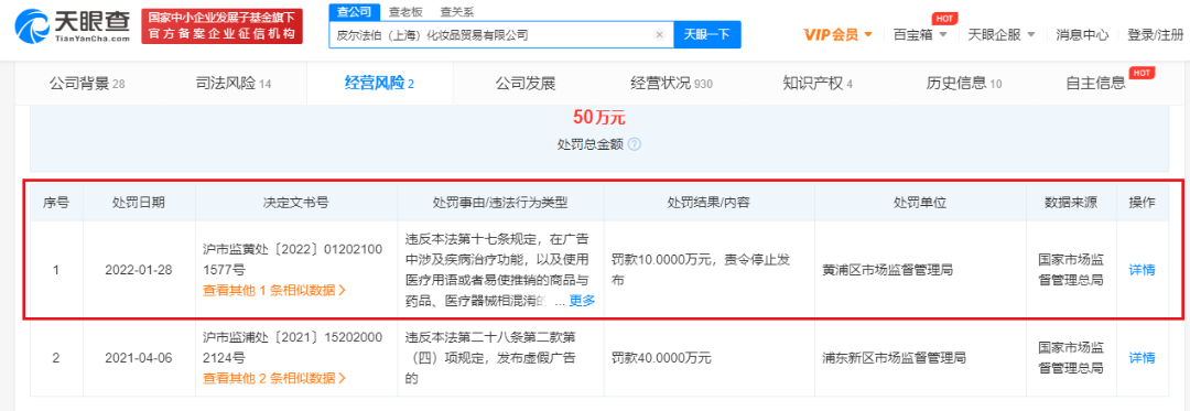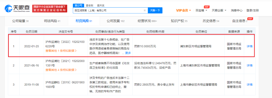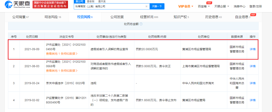 除雅漾外,C2CC传媒记者在天眼查发现,科蒂商贸(上海)有限公司也曾因主播推荐产品时,宣传产品有镇静消炎的效果,而被黄浦区市场监督管理局判定虚假或者引人误解的商业宣传 ,罚款20万元。