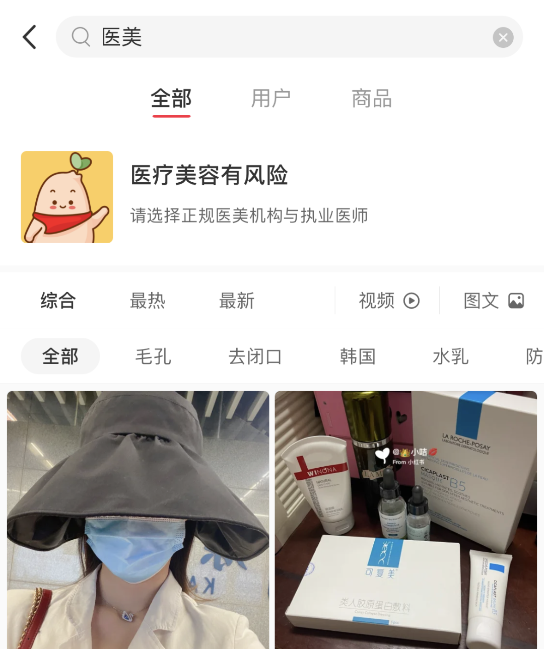 值得一提的是,C2CC传媒记者在小红书平台上以“医美”为关键词进行搜索,发现上笔记最上方有明显的提示(温馨提醒):“医疗美容有风险,请选择正规医美机构与执业医师”。