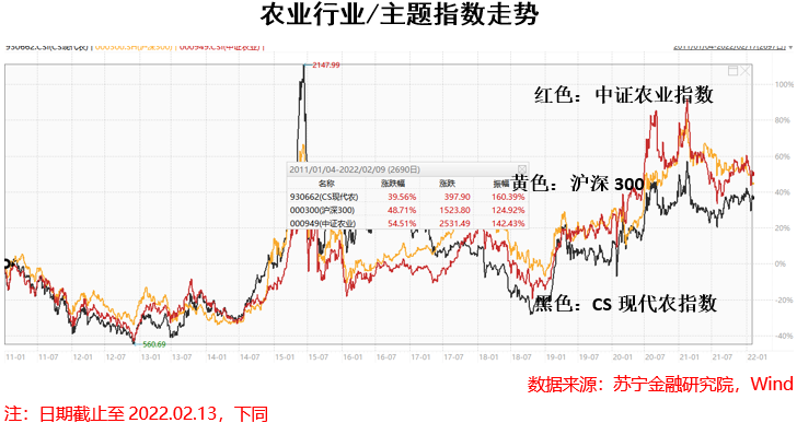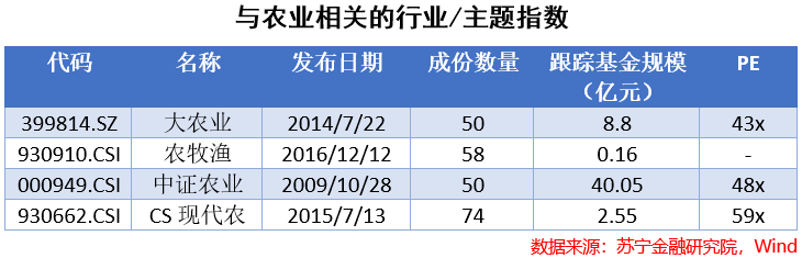 从指数来看,与农业相关且有基金跟踪的行业或主题指数共有七个,但其中部分为农业的下游如细分食品指数,以及细分子行业如农业机械,这些指数与农业本身相对偏离较大。综合来看,符合农业本身的行业指数共有四个。