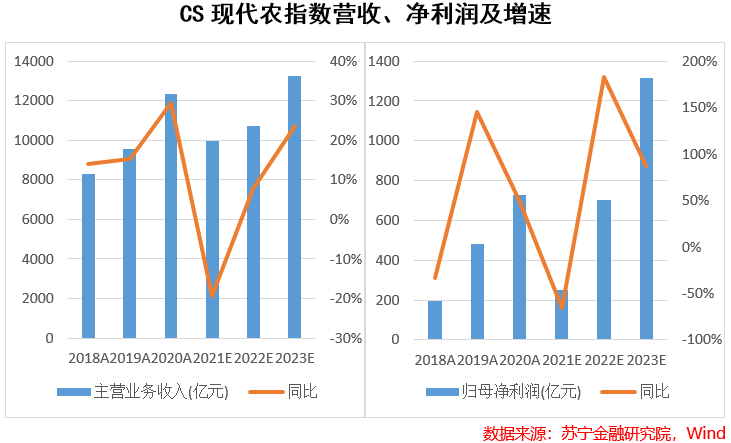估值之外,再来看CS现代农的盈利能力。其中影响最大的仍然是生猪养殖企业,“猪周期”之下,2020年之前的几年,行业普遍盈利较好,营收及净利润都维持看了一定的增长。但从本轮猪价下行的周期开始,指数盈利能力极速恶化,2021年主要养猪企业业绩均大幅度亏损,指数整体营收同比负增长近20%,净利润同比负增长超50%。不过随着猪价下行周期的结束,猪价已经开启了上行阶段。市场一致预期指数未来盈利能力大幅度向好。