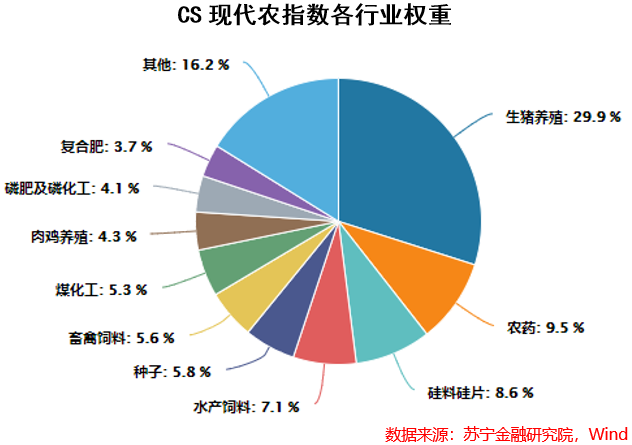 从CS现代农指数的行业构成看,涵盖了上下游产业链各个环节,如上游的种子、饲料、化肥,下游的农副食品的加工销售。其中生猪养殖、农药、水产养殖(其中涵盖硅料硅片,为“渔光一体”产业模式)占比最大。特别是生猪养殖,行业权重占比近30%,可以说生猪养殖的行情一定程度上左右了CS现代农指数的走势,因此现代农指数在行情上也表现出了一定的周期性质。