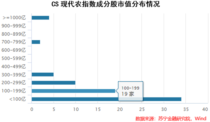 从CS现代农指数成分股的市值分布情况,小市值公司占绝大多数,100亿以下的公司共34家,市值在100亿元-200亿之间的公司共19家,两者合计数量占全部成分股数量比重超过70%。这也反映了农业较为分散、竞争激烈的市场格局。
