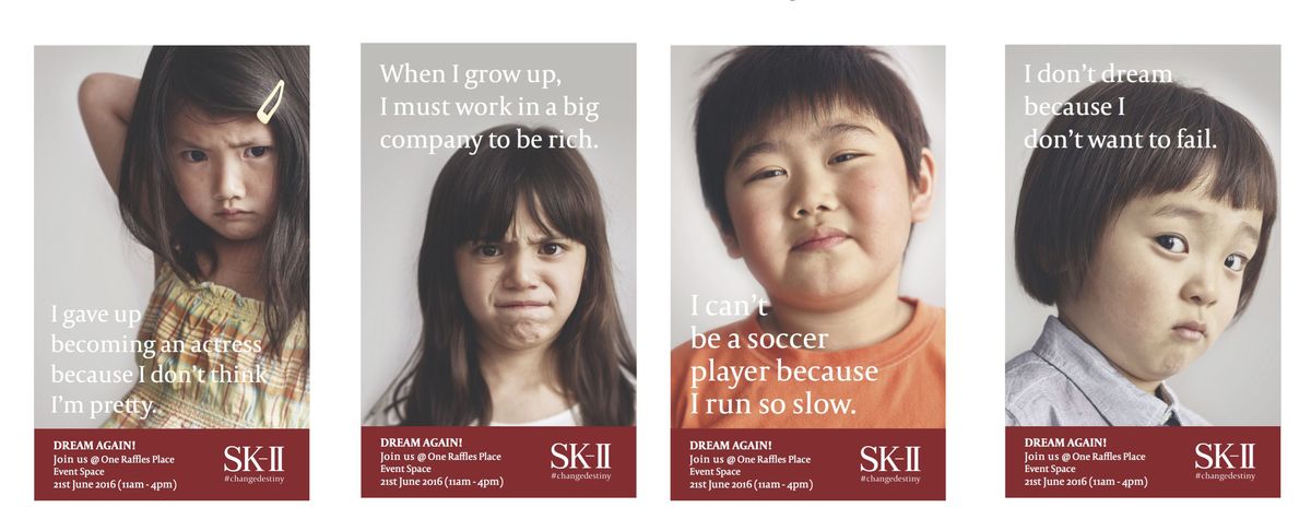 凭借相亲角宣传片在戛纳抢镜的SK-II,最近的风向有些怪:刚给剩女送关怀,转头就用10后的脸做起了宣传海报。6月21日,SK-II用小孩子的大头宣传照,在长城上摆出了主题为“梦想”的展览。搭配10后表情包的是一系列“我想要做XX”的简短文案。