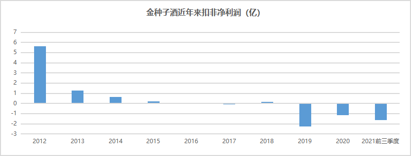 需要注意的是,近年来金种子酒扣非净利润连年下降,从2012年最高的5.61亿到2019—2021年连续三年的大幅亏损,没有看到任何好转迹象。