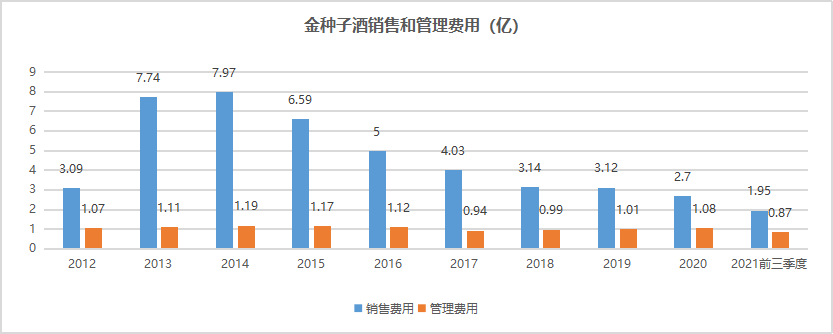 数据来源:金种子酒财报 如果不是2020年非经常性损益项目将净利润“扶正”,则很可能面临退市风险。而促使归母净利转正的是一笔政府征地补偿款。 而看金种子的销售和管理费用,尤其是销售费用,除了2012年没有超过净利润,剩余几年都是大幅超越,还包括过高的管理费用。很难想象当下金种子的经营管理已经到了何种程度。
