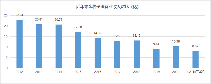 图表来源:金种子酒财报 从营收角度看也十分明显。自2012年的上一轮的繁荣周期后,营收规模便一路下降,至近两年已经腰斩。