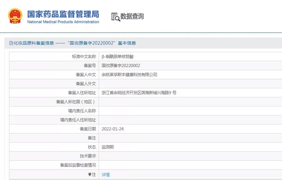 根据国家药监局化妆品原料备案信息平台的信息显示,β-烟酰胺单核苷酸的备案人为余姚莱孚斯本健康科技有限公司(下称莱孚斯本),其备案号为国妆原备字20220002,该新原料的备案日期显示为2022年1月24日。