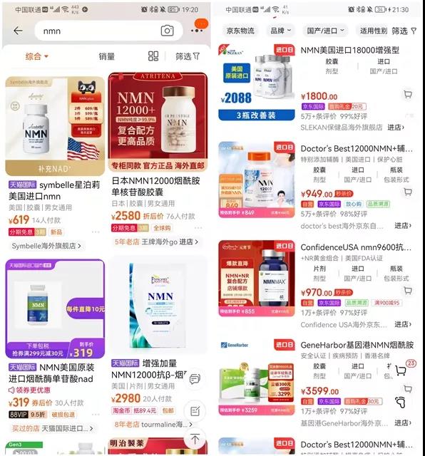 因此,NMN保健类产品均是以跨境电商或代购的形式进行销售。这类产品主要宣传“抗衰逆龄、修复DNA、预防老年痴呆”等,目前在京东国际、天猫国际等平台有大量的相关产品。