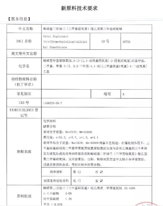 根据鲸蜡基二甘油三(三甲基硅氧基)硅乙基聚二甲基硅氧烷的技术要求显示,该原料使用目的显示为乳化剂,颜色为无色至淡棕色,性状为半透明特体,有轻微气味,适用范围为2-8%。而甲基倍半硅氧烷/三甲基硅烷氧基硅酸酯的“技术要求”内容则无法打开。喻敏根据该原料的名称预估,这有可能是一款普通的应用功能材料,即在配方中起辅助作用的成分,不属于功效成分。