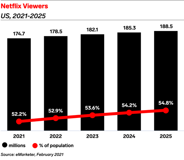 例如,下图显示了美国的Netflix Prime用户数量。可以看出,Netflix的主要用户在2021年已达到1.747 亿——占美国总人口的52.2%——在网络世界中无可争议的主导地位。