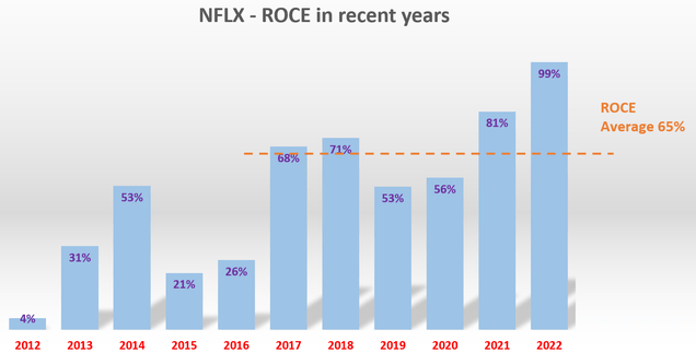 NFLX过去几年的ROCE约为65%,即使与FAAMG组中的其他优秀者相比,也是一个非常可观的水平。