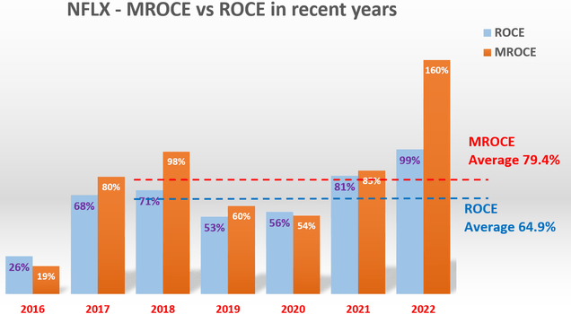 下图显示的结果表明,在这个阶段,NFLX实际上已经能够维持一个高于平均ROCE的MROCE。如图所示,近年来ROCE平均为65%,MROCE平均为79%,高出平均14%。