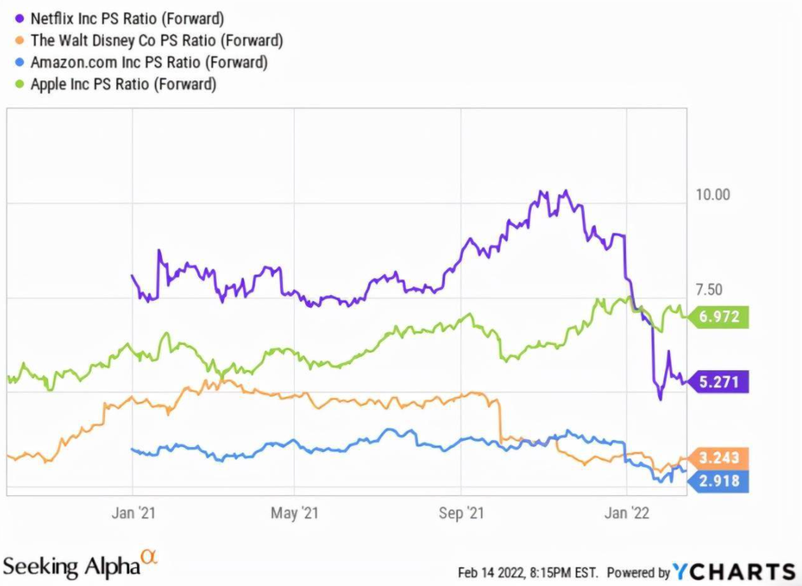 在PS的基础上,Netflix的估值是5.2倍。这本身就是一个昂贵的估值(考虑到接近历史峰值的整体市场,估值“仅”约为3倍)。