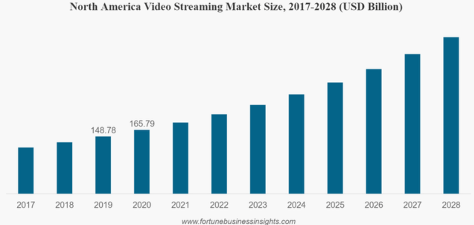 从下图中可以看出,视频流市场预计将从2021年的4190亿美元增长到2028年的9320亿美元,2021-2028 年期间的复合年增长率为12.1%。这是一个潜有5130亿美元的增长空间的市场。