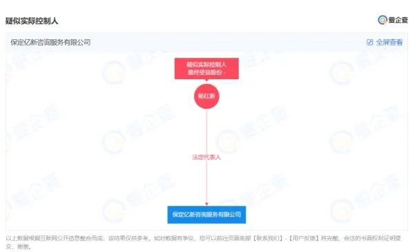 据爱企查显示,保定亿新咨询服务有限公司已注销,注销之前疑似实际控制人为杨红新,而杨红新为蜂巢能源首席执行官。