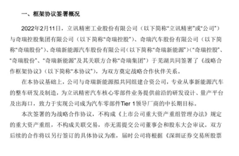 2月11日,立讯精密与奇瑞控股、奇瑞股份、奇瑞新能源于芜湖共同签署了《战略合作框架协议》。一时间,“果链一哥”(苹果产业链)立讯精密下场造车的消息铺天盖地袭来。股价也应声而涨,从消息发布前的41.05元最高涨到了每股45.8元,资本市场普遍认为此举可以进一步打开其中长线的增长空间。