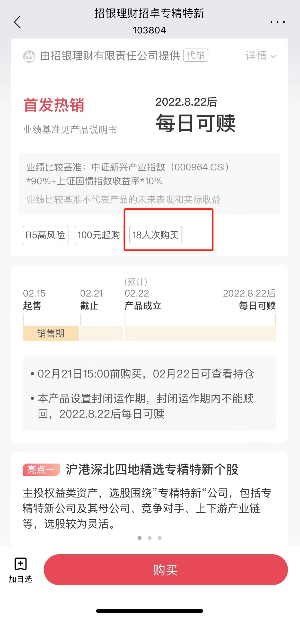 由于尚处在发售期,最终募集规模尚未知晓。不过,截至目前,该产品募集状况似乎并不太理想。招行APP显示,截至2月18日15:00时,仅有18人购买。界面新闻记者注意到,同期发售的招银理财其他产品认购人次均在2000人次左右。