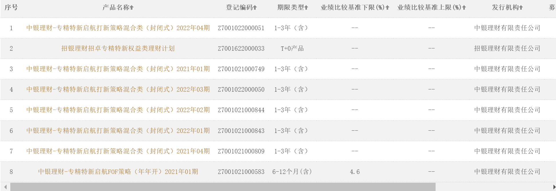 事实上,招银理财并非首个发行专精特新主题理财的理财子公司。中国理财网显示,中银理财已经发行7只专精特新为名称的主题理财,涵盖FOF、打新等多种策略,且均为混合型理财产品。