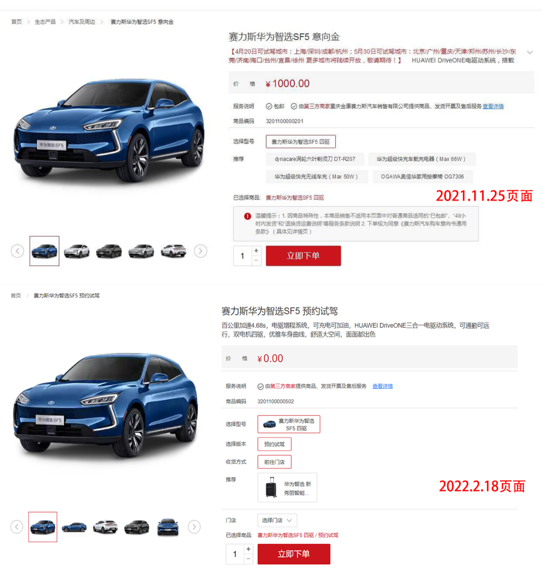 华为智选SF5订购页面的变化,截图自华为商城官网