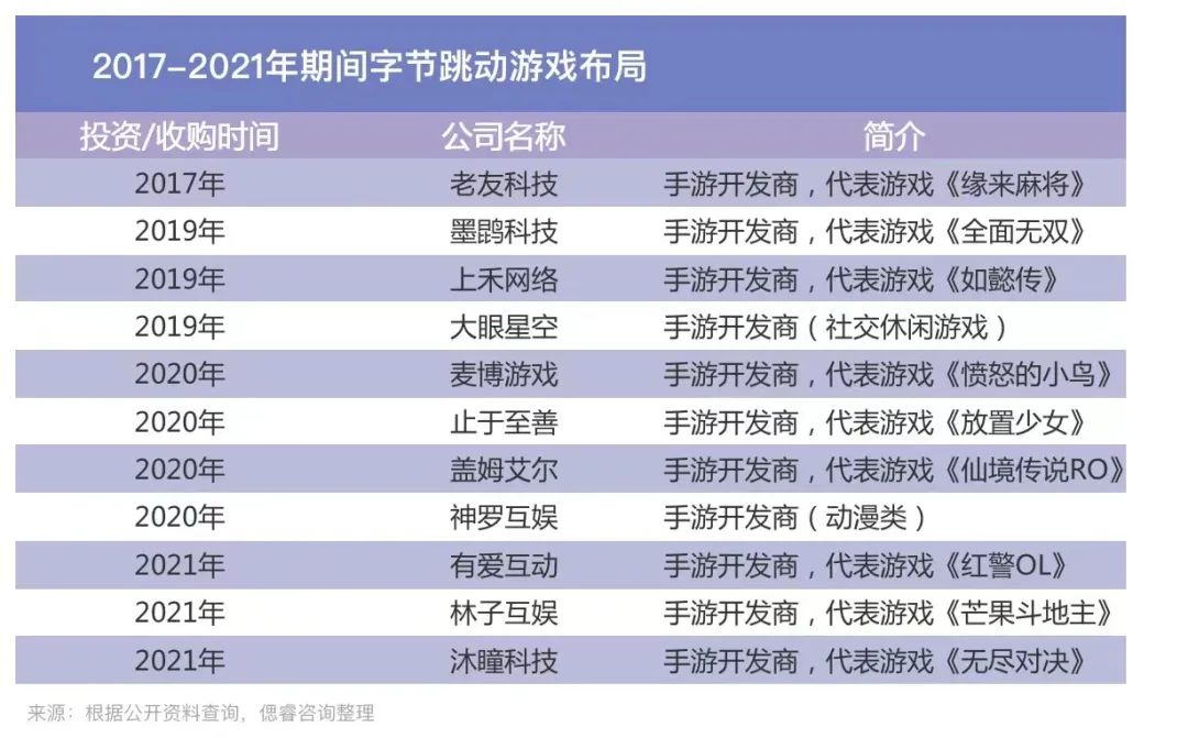 在2017-2021年间,字节跳动先后收购多家手游开发商,在移动游戏领域占有一定市场。其中,手游《仙境传说RO:新世代的诞生》曾在2020年10月上线后取得13个月充值流水接近24亿元的好成绩。