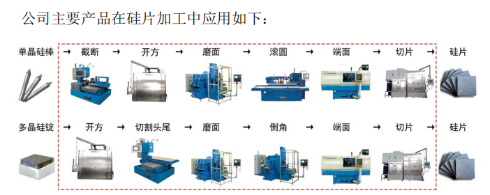 根据招股说明书披露,公司当时已是光伏专用加工设备供应商,以单晶硅生产过程为例,其加工工艺包括截断、开方、切片等。其中,切片是整个硅片加工流程中最为重要的一环。