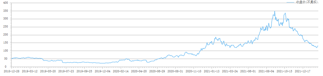 自2021年10月下旬以来,公司股价开始回调。2022年2月18日当日收盘价达128元,距离最高价已跌去超六成,当前市值达352亿元,半年时间市值跌去超630亿元。当前公司市盈率为22倍。