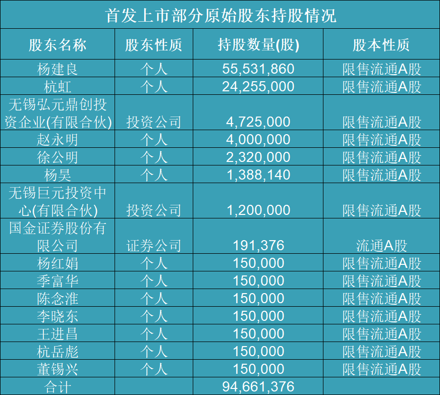 2021年前三季度,杨建良、杭虹、杨昊共持有公司股份达56.8%。2021年12月28日1.71亿股原始股份已解禁,占总股本比例约62%。