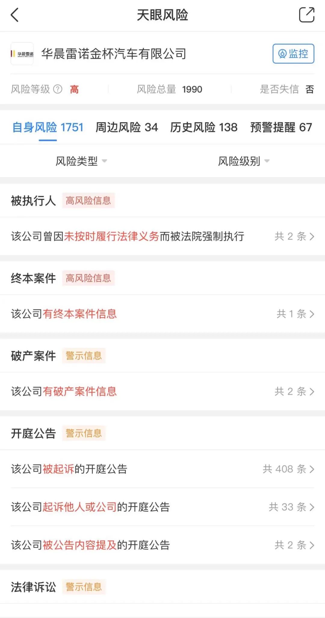 天眼查数据显示,华晨雷诺金杯汽车有限公司因牵涉1990条法律风险而被列为“高风险等级”。截至2022年2月,该公司已两次因未按时履行法律义务而被法院强制执行。此外,该公司被起诉的开庭公告则达到408条之多。其中,大多案件均与零部件采购、互联网服务采买有关。