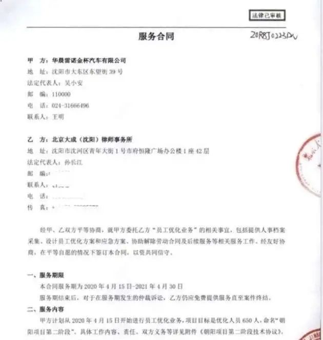 自2020年年初起,华晨雷诺连续进行了至少两次大规模裁员。该公司2020年7月被曝光的一份人员优化合同文件显示,至2021年4月底,华晨雷诺金杯计划“优化”员工650人,约占当时沈阳工厂员工的20%。