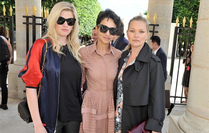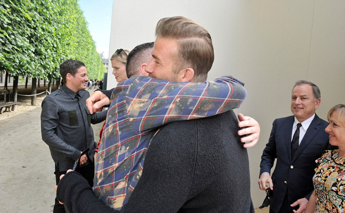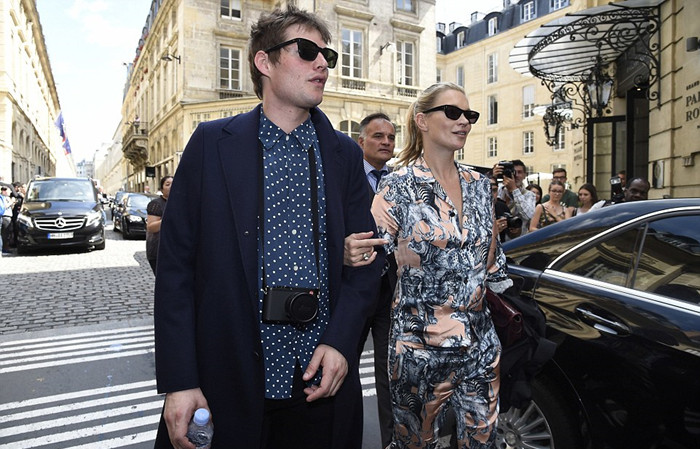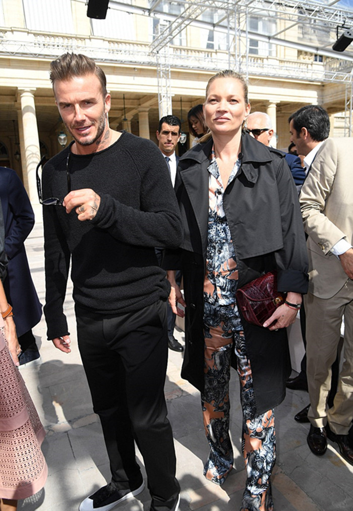 贝克汉姆则显得简约时尚——从头到脚都是黑色。他穿了一件宽松的水手领上衣,搭配精心剪裁的牛仔裤,更加突出他原本就极其出色的外貌。和这时尚二人组一起的还有凯特29岁的男友Count Nikolai von Bismarck,他穿了一件深蓝的圆点上衣,外面是一件深蓝的短大衣,展示出他的时尚嗅觉。当然,凯特还展现出了自己在时尚界的广阔人脉,她与执掌LV男装部的时尚总监Kim Jones相谈甚欢。