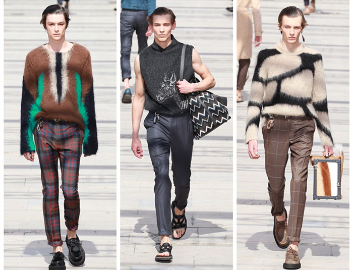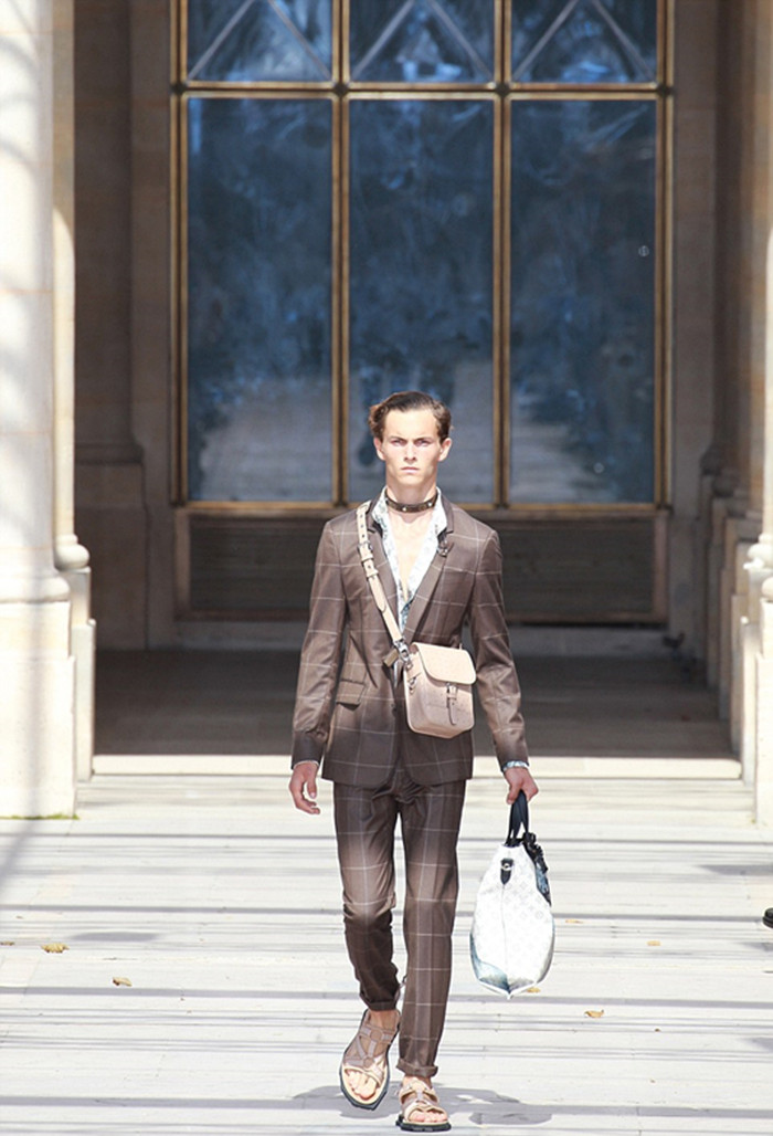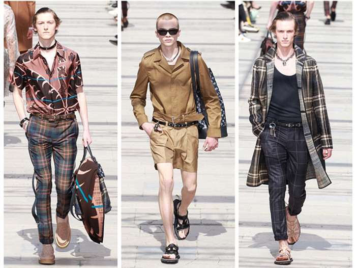 LV此次发布的2017春夏男装系列展示了面料和色彩的绝佳组合。马海毛的针织衫搭配格子花纹的长裤——独一无二的组合。这次男装秀上出现了大量格子,西装、锥形裤和外套都采用了格子图案。当然,LV标志性的印花和蛇皮革也是秀场的另一大焦点。演员兼模特法丽塔·凯尔法(Farida Khelfa)也在场,三位美女模特挨着在一起合了影。