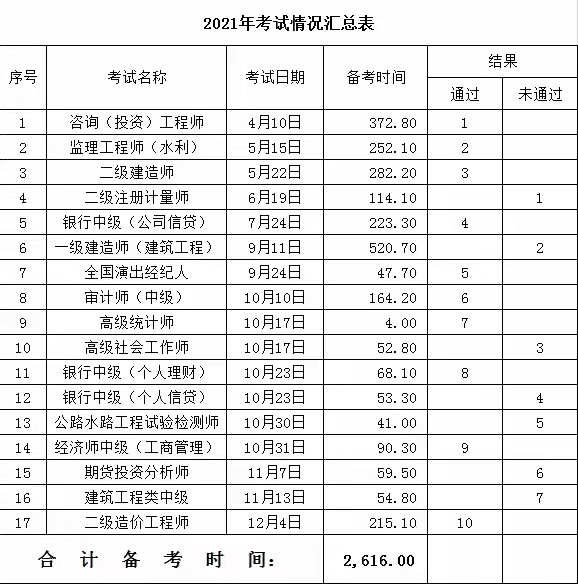近四年时间,他的考证路一年比一年疯狂。2018年5证、2019年7证、2020年9证,终于在2021年那一年拿下10证,完成挑战。这“10证”包括高级统计师、咨询工程师、二级建造师、二级造价师等,是参加了十七场考试换来的。他考证的“天赋”早在2018年就被验证过了,被行业人士视为超高难度的“法考”,他备考了100多天后一次通过。
