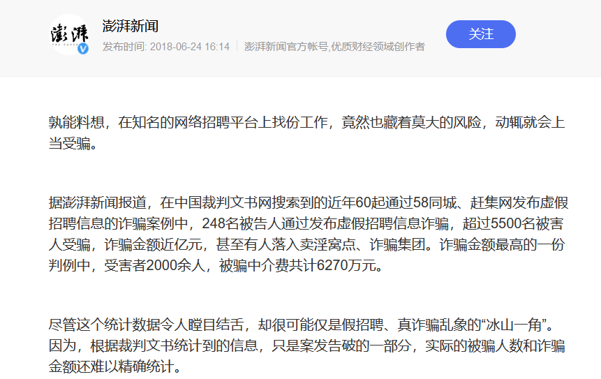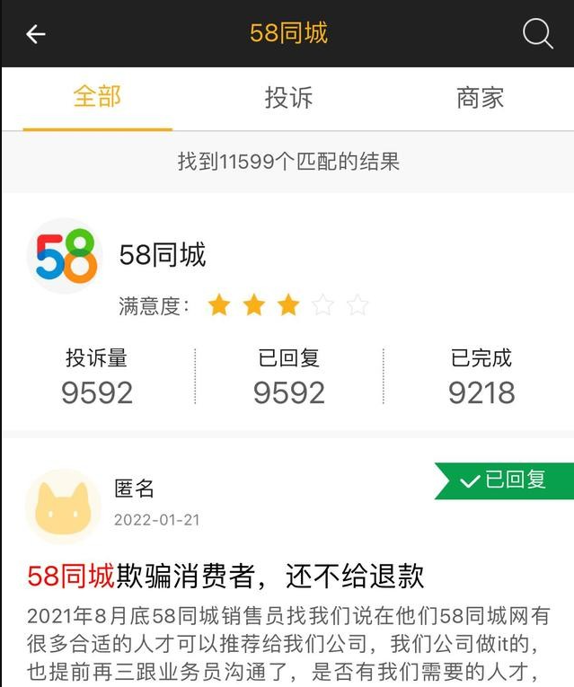 值得注意的是,这并不是58同城第一次因为虚假消息而陷入争议。一直以来,58同城因平台信息虚假持续被消费者投诉,黑猫投诉平台上关于58同城的投诉高达11599条,据澎湃新闻报道,仅2018年上半年就有近60起关于58同城和赶集网虚假招聘诈骗的案例。这些案例中受骗者超5500人,诈骗金额近亿元。