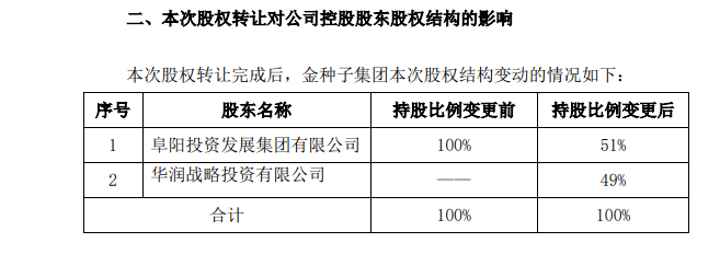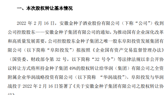 2月16日晚间,金种子酒发布称公告,公司控股股东安徽金种子集团有限公司之唯一股东阜阳投资发展集团有限公司,拟以非公开协议转让方式将所持金种子集团49%的股权转让给华润(集团)有限公司之全资附属企业华润战略投资有限公司。