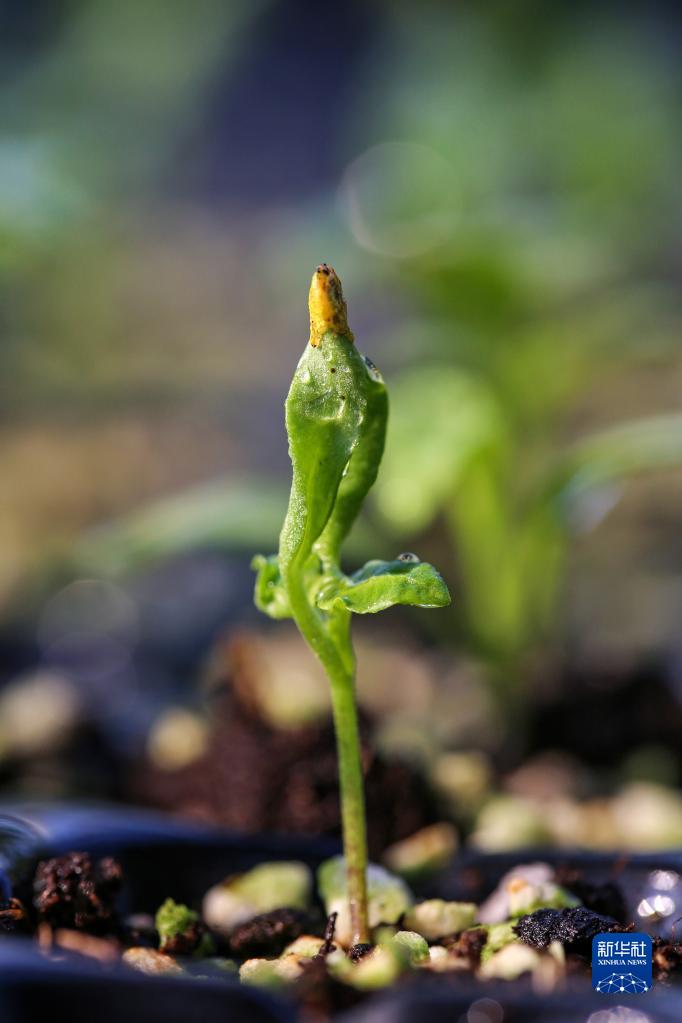 2月12日,在云南省红河哈尼族彝族自治州蒙自市草坝镇春晓种苗基地,刚刚浇过水的辣椒苗在阳光下生机勃勃。新华社发(张洪科 摄)