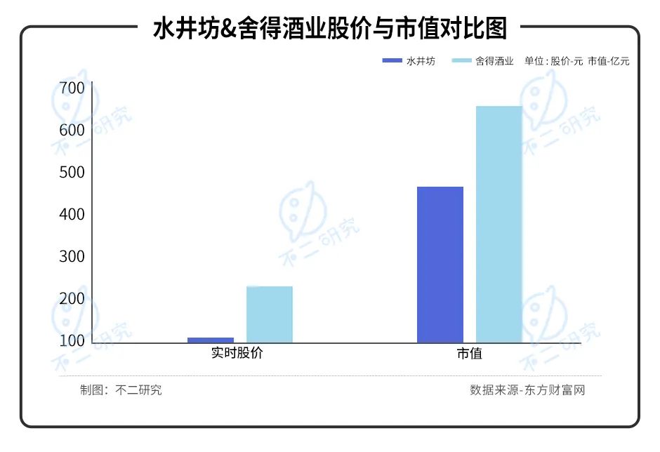 截至2月18日,水井坊报收100.26元/股,对应市值489.26亿元;舍得酒业报收200.77元/股,对应市值666.56亿元。