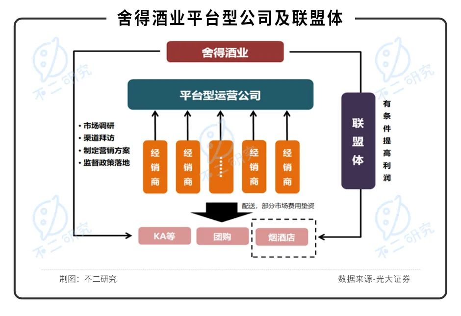 2020年至今,随着天洋系退场,原舍得元老回归。在复星系进驻后,舍得酒业在原“1+1”渠道的基础上,通过平台型、经销商联盟、KOL、直销四种模式共同推近舍得酒业渠道模式。