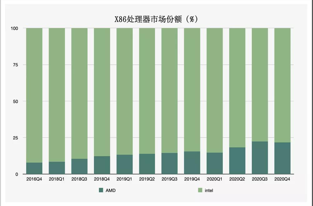资本市场也对二者给出完全不同的评判:2020年,英特尔市值蒸发15%,AMD却上涨了80%。