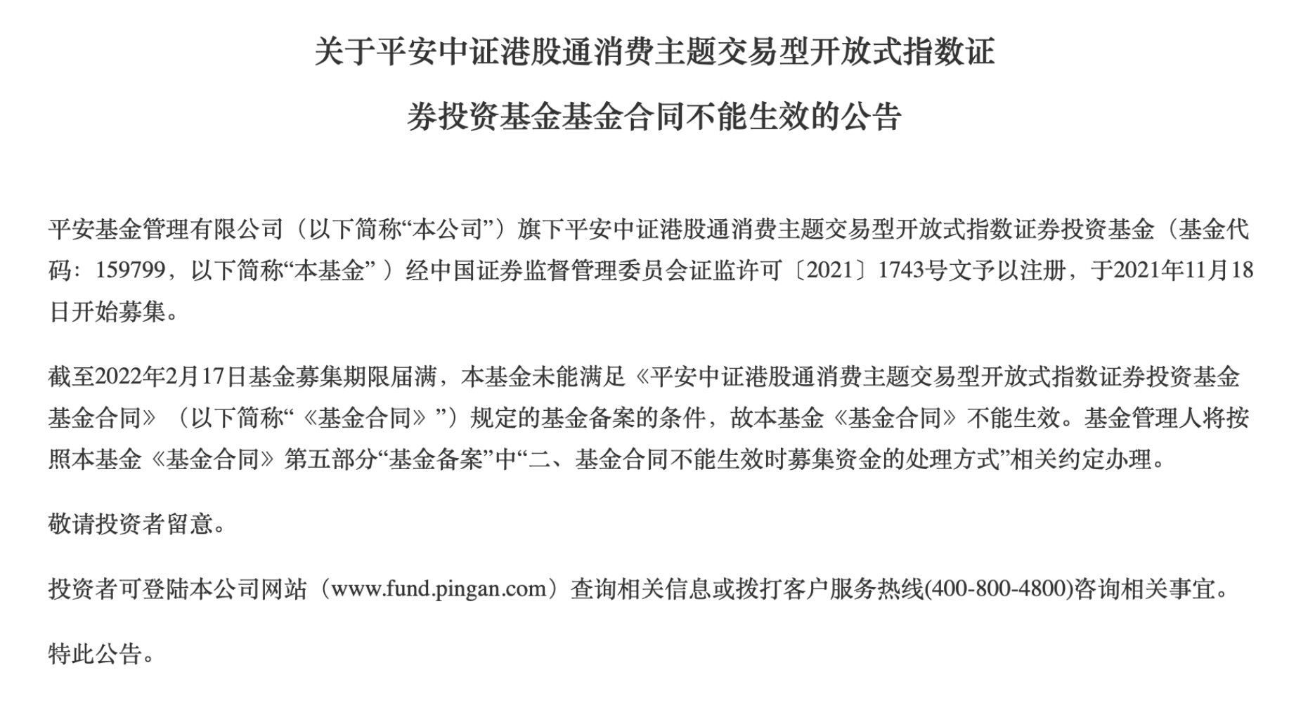 2月19日,平安基金发布公告称,平安中证港股通消费主题ETF于2021年11月18日开始募集,截止2月17日基金募集期限届满,因未能满足《基金合同》规定的基金备案的条件,募集失败。