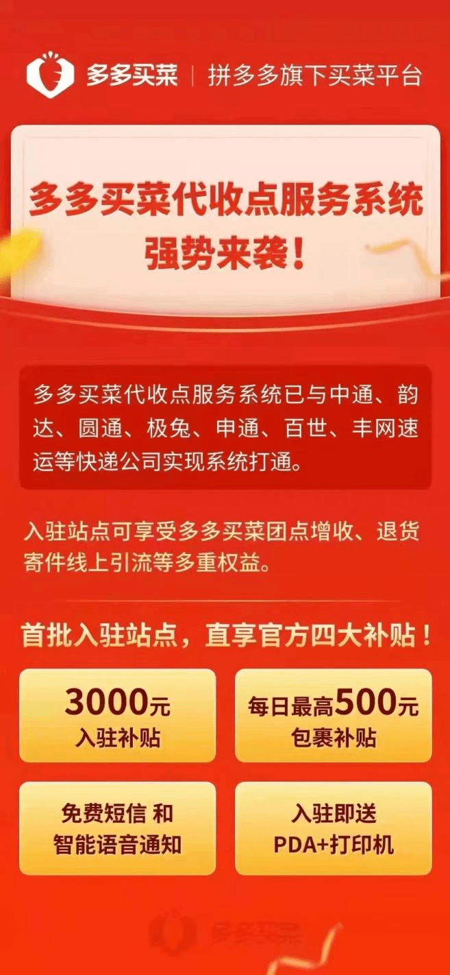 春节后,多多买菜开始吸引快递站点采用多多买菜系统收发快递。据宣传资料,多买菜代收点目前与中通、圆通、申通、韵达、邮政、极兔等快递公司已经实现了系统打通。代收点现在入驻可享高额补贴。