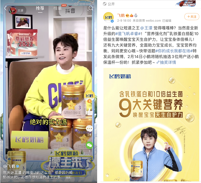飞鹤则押中了本届冬奥解说届的顶流,牵手王濛为品牌挚友,在王濛直播节目《濛主来了》中将产品星飞帆卓睿摆放在显眼位置,进行宣传。同时配合#你的成长我都在场#话题,持续提升了产品声量。