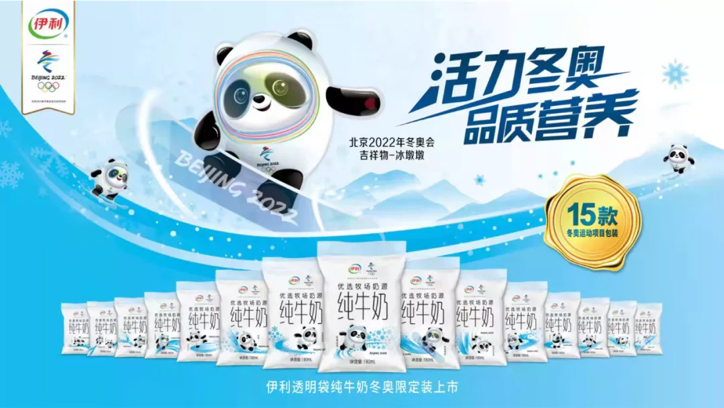 伊利旗下透明袋纯牛奶也推出15款北京冬奥冰墩墩版限定版包装,巧妙地通过冰墩墩可爱造型,呈现了短道速滑、速滑滑冰、自由式滑雪等北京冬奥会全部分项动作,成为网友争相晒图的明星产品。