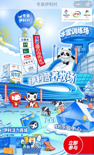 作为构建用户粘性的核心阵地,在线上,伊利推出活力商城“扫码赢好礼,我耀冬奥年”小程序抽奖互动活动传递伊利“奥运品质,我耀此刻”的新年传播主张。此外,伊利也专门也开设了冬奥主题小程序“冬奥伊利村”,消费者可以做任务喂养奶牛,攒够奶滴便可进入“我的乐园中心”中的”兑换商城“,兑换冬奥周边,包括人气顶流冰墩墩、雪容融吉祥物系列周边。