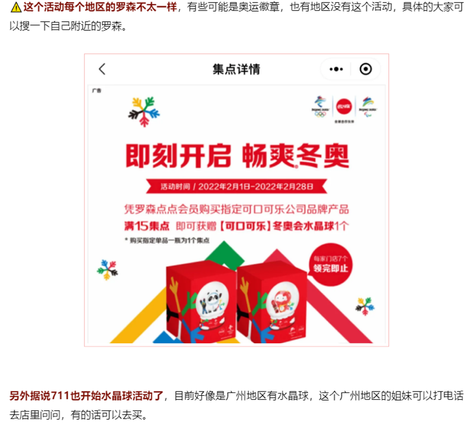 2月期间,罗森便利店发起冬奥集点活动,购买一瓶指定可口可乐产品即可获得1个集点,集满24点,即可获赠冰墩墩或雪容融冬奥会水晶球一个,据了解,7-Eleven也开展了类似活动。