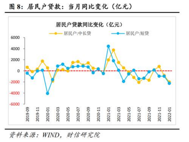 数据显示,1月份居民部门新增贷款8430亿元,同比少增4270亿元。其中,与实体消费更加密切的居民新增短贷约1000亿元,同比减少2272亿元,也低于近五年同期历史均值,表明受国内疫情加重影响,服务业、消费恢复偏弱导致居民消费类融资需求下降。