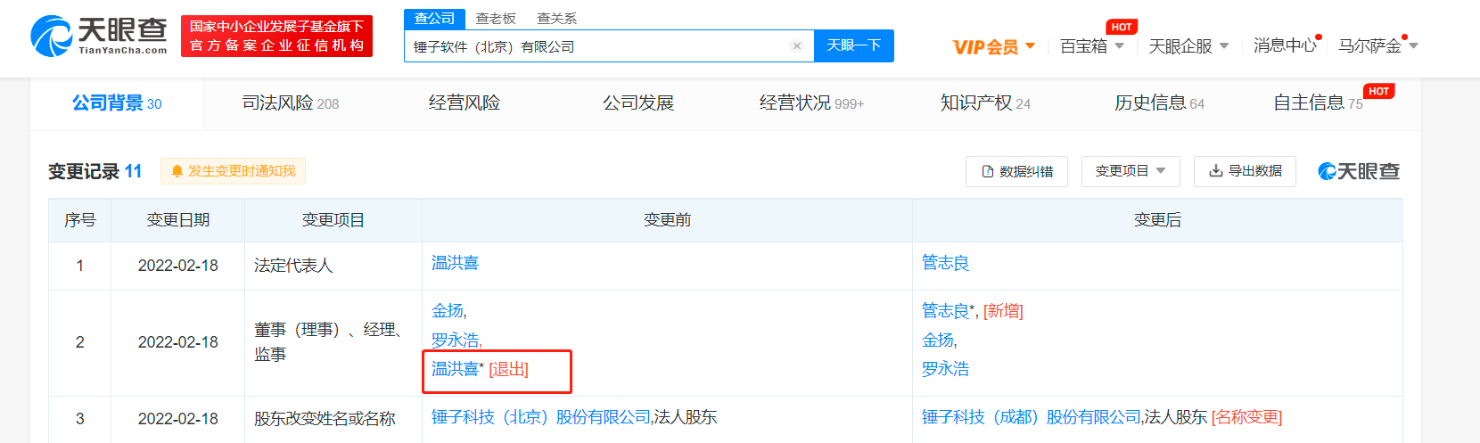 天眼查App显示,2月18日,锤子软件(北京)有限公司发生工商变更,法定代表人由温洪喜变更为管志良。