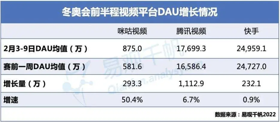 从易观千帆的数据来看,咪咕视频即使在冬奥开始、日活快速增长之后,日均活跃用户数也仅875万,而快手则是远高于咪咕视频的2.5亿。